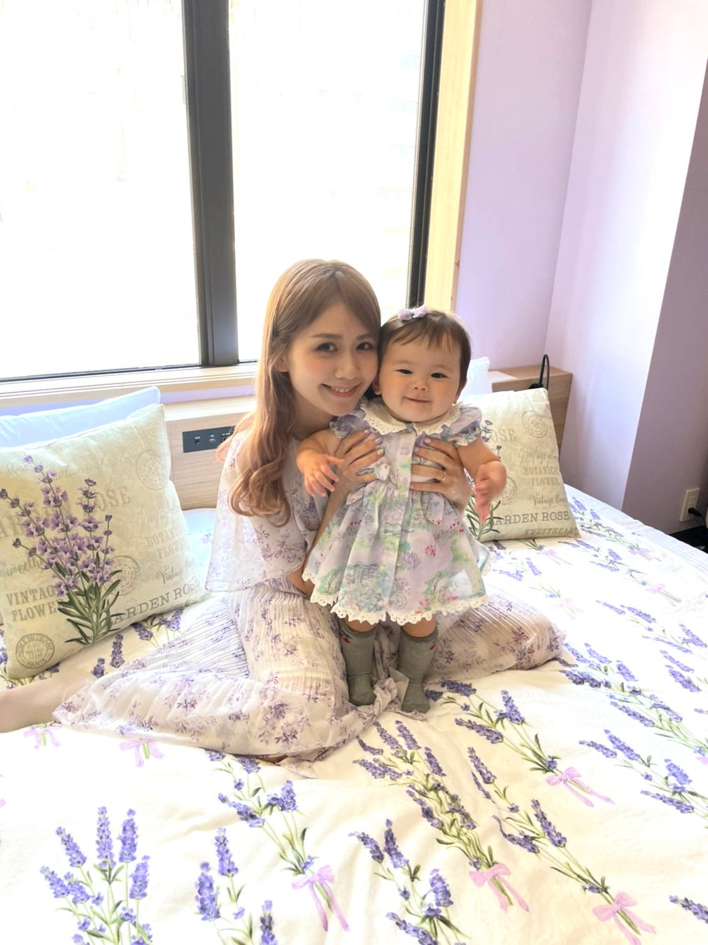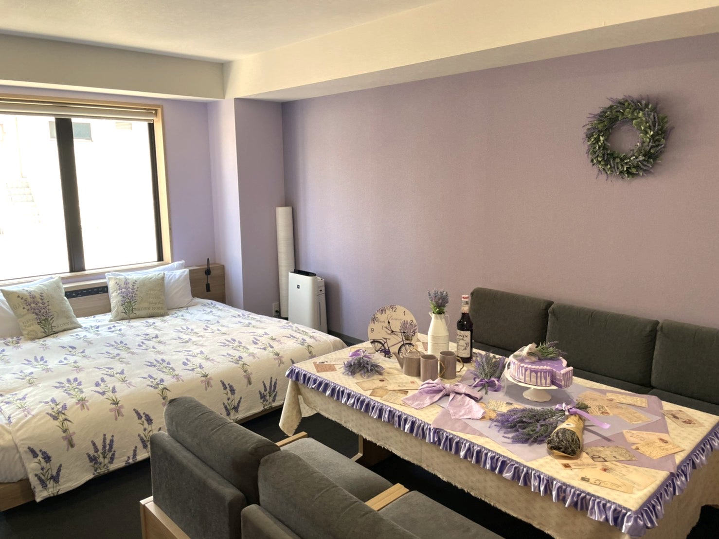 壁紙から、ベッド、ダイニングスペース、食器や小物までラベンダーアイテムで揃えたお部屋は「MIMARU東京 日本橋水天宮前」にて提供。