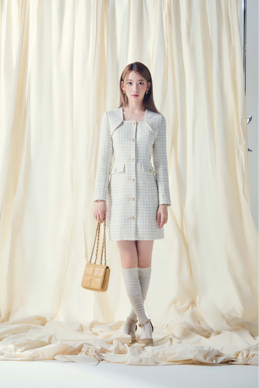 ジャケットを羽織っているかのようなディテールや上品なラメが織り込まれたオリジナルのツイード生地、