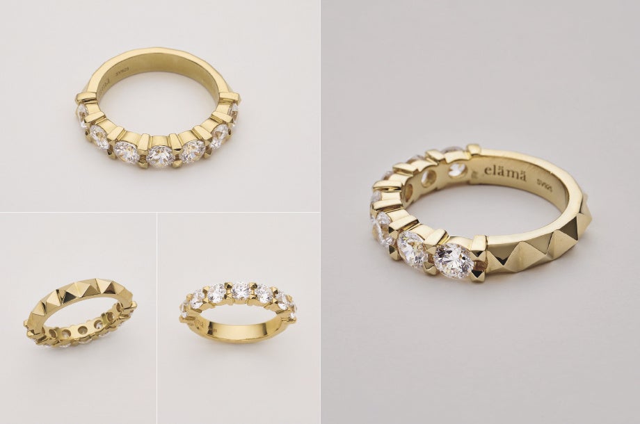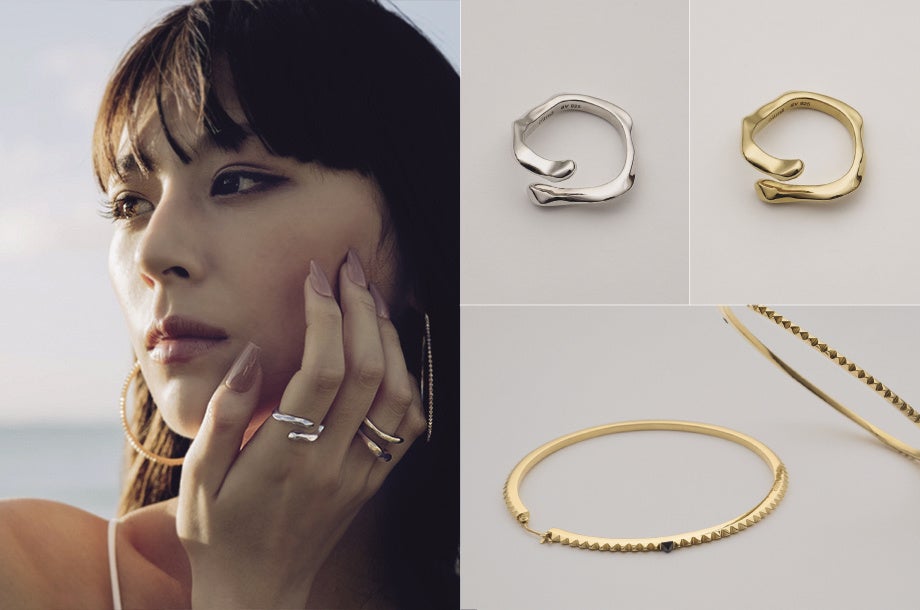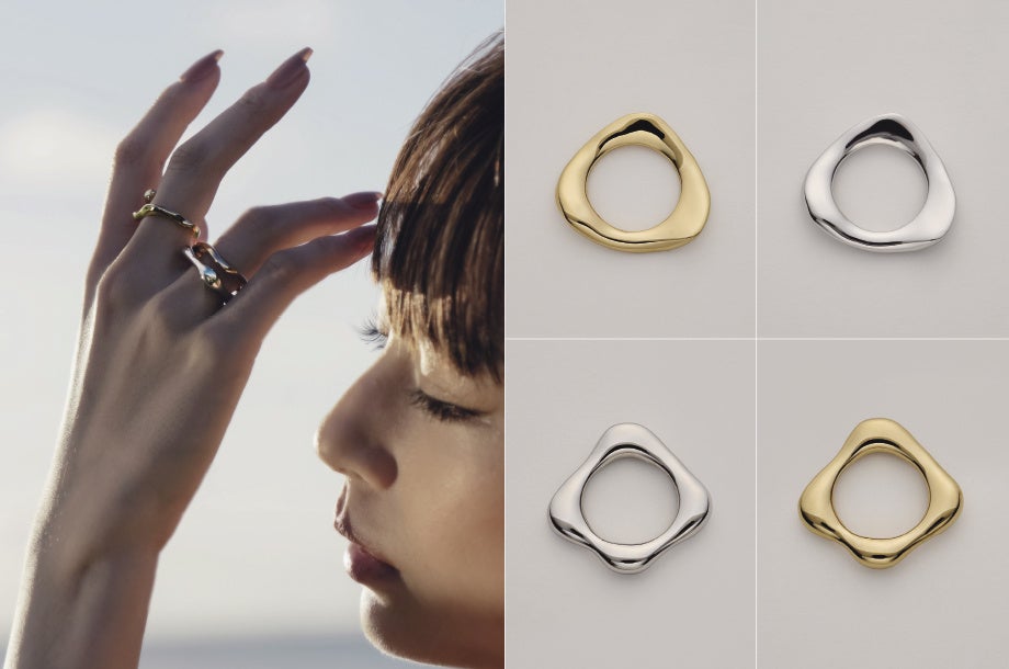 ⾃⾝の“型にはまらず⽣きていきたい”という想いから、アクセサリーデザインにも⾃由さや多⾯性を表現した。いろいろな使い⽅ができたり、⾒る⾓度で表情が違ったり、多様性を感じるデザインを意識したリング・ピアスなどをラインアップ。愛犬とお揃いのリングをシェアできる⾸輪も。