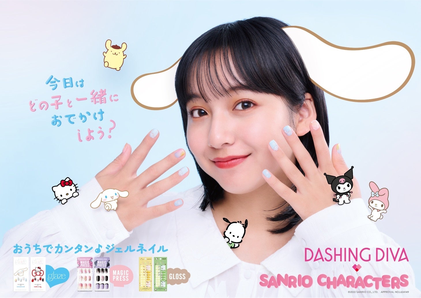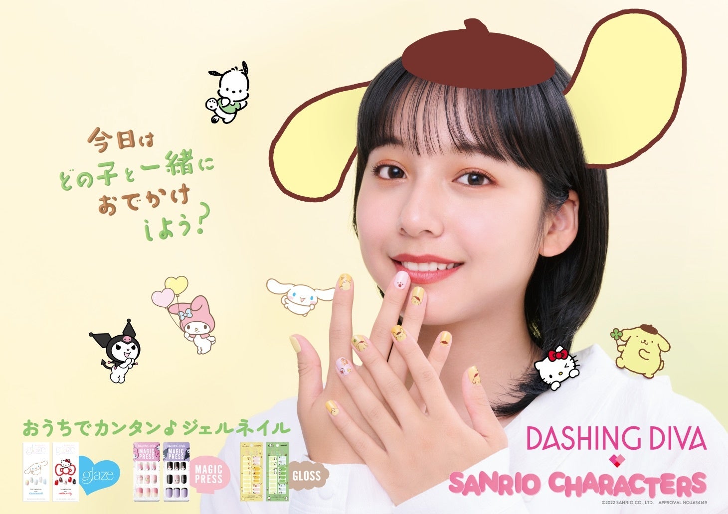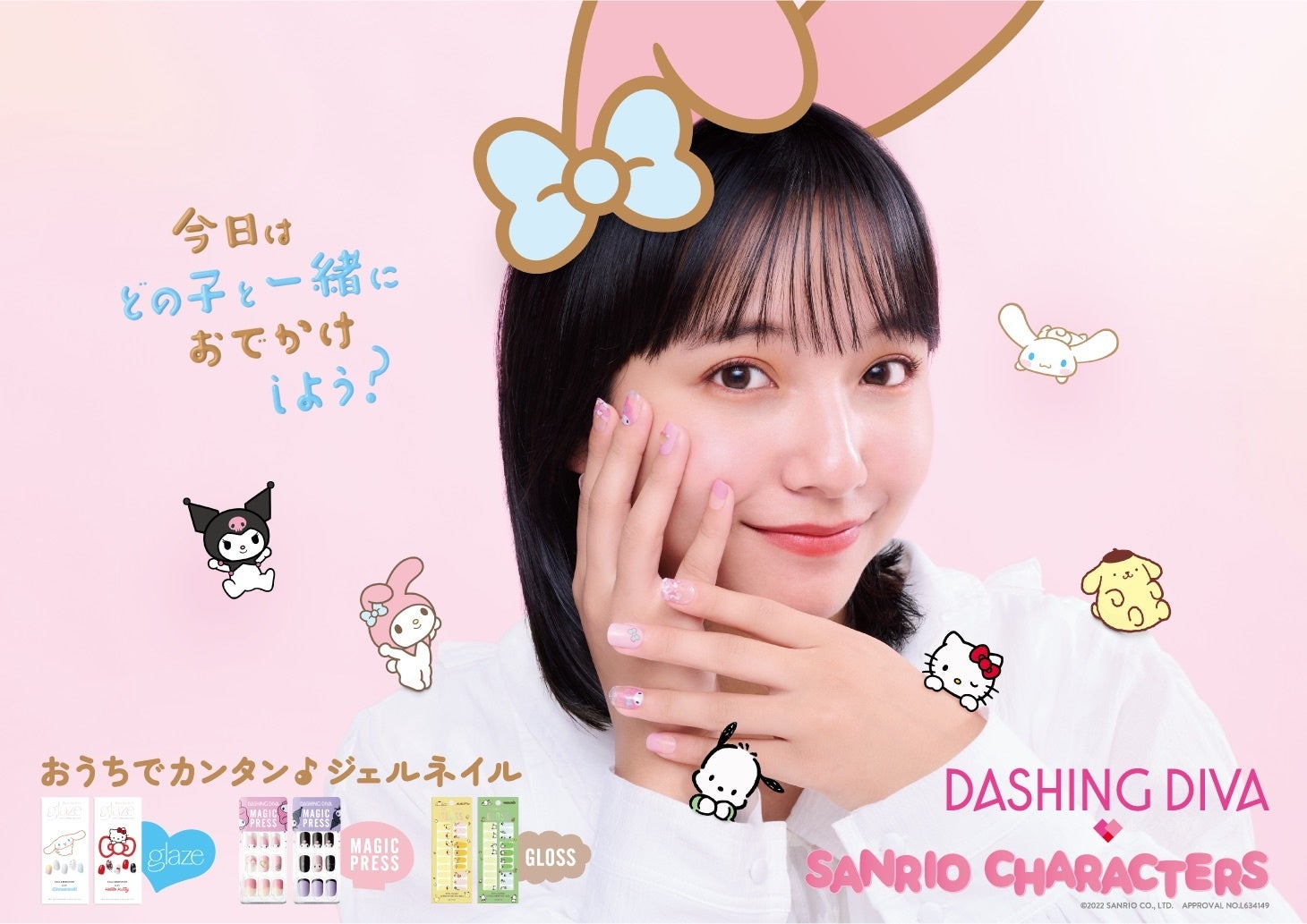「今日はどの子と一緒におでかけしよう?」というコピーのもと、おでかけ前に6キャラクターから選んで、自宅で簡単に自分のファッションの一部にできるジェルネイルをビジュアル化するために「glaze」はシナモロール、「MAGIC PRESS」はマイメロディ、「GLOSS」はポムポムプリンと、商品に合わせて山之内とキャクターが一緒にいる?表現にいたしました。是非、皆さんもお気に入りのキャラクターと一緒におでかけを楽しんでください。