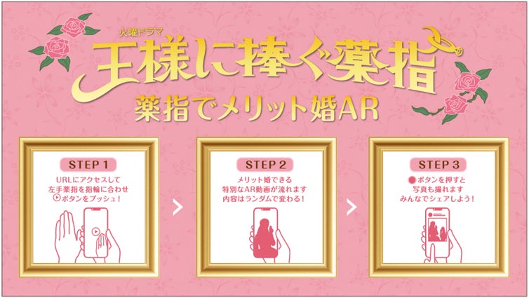 4月18日(火)より放送を開始する火曜ドラマ『王様に捧ぐ薬指』(橋本環奈・山田涼介)の番組プロモーションの一環として、”メリット婚”が鍵となるドラマの世界観を疑似体験してもらうために、左手にスマホをかざすと薬指に指輪がつけられ、橋本が演じる綾華と山田が演じる東郷のどちらかが語りかけてくれる「薬指でメリット婚AR」を4月10日(月)より番組公式Twitterアカウントなどから配信!