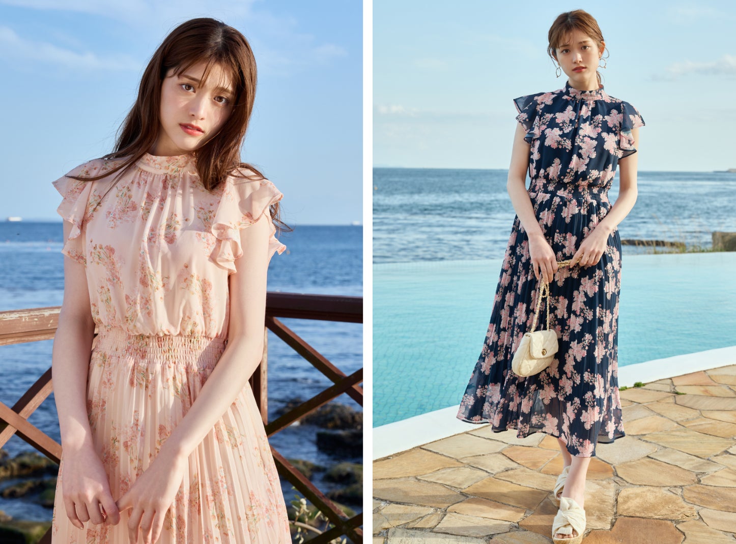 青空に映える「ピンク」のドラマティックなティアードデザインのキャミドレス。