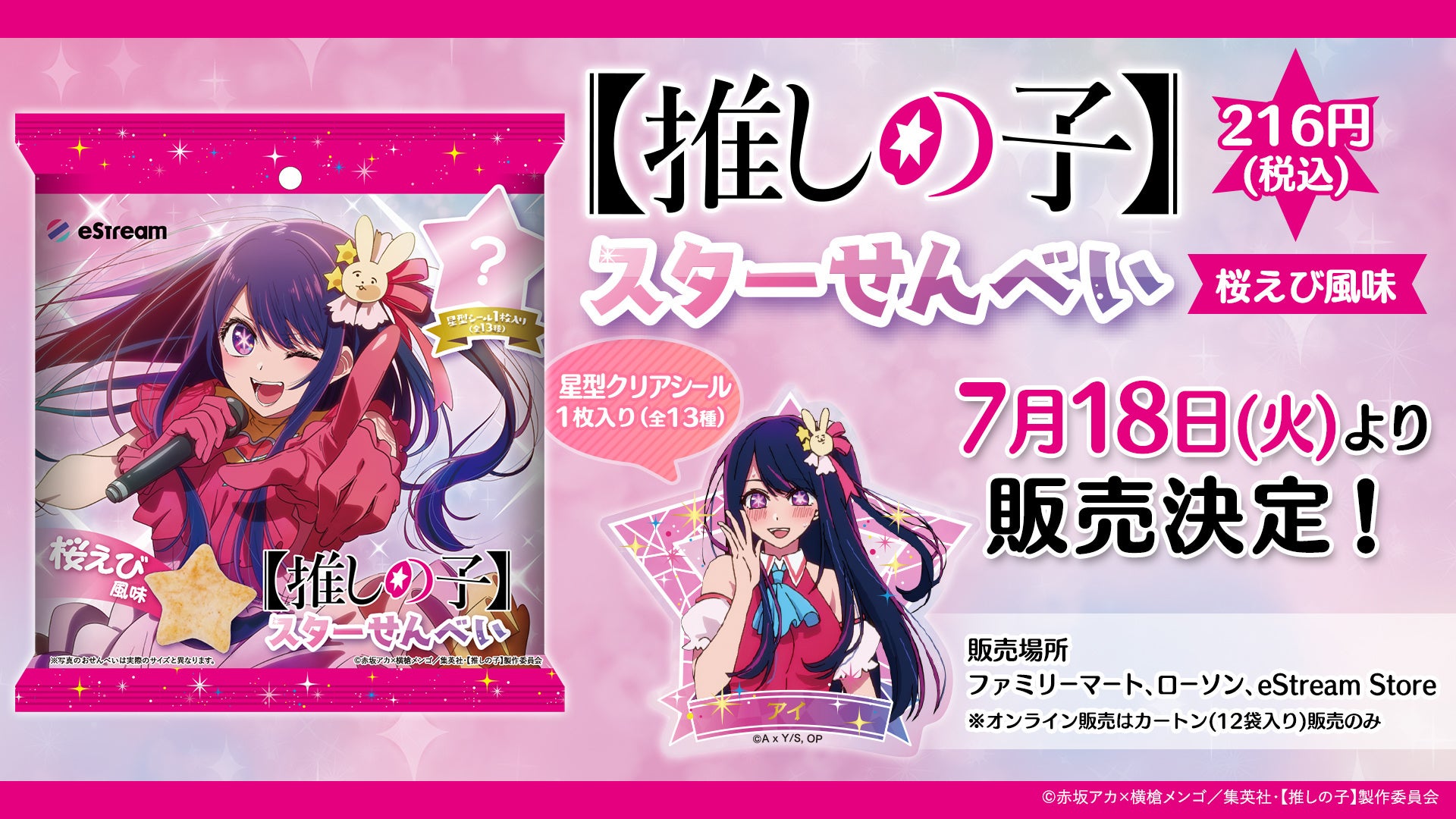 TVアニメ【推しの子】より人気キャラクターのオリジナルシール付き『【推しの子】スターせんべい 桜えび風味』の発売を決定!
