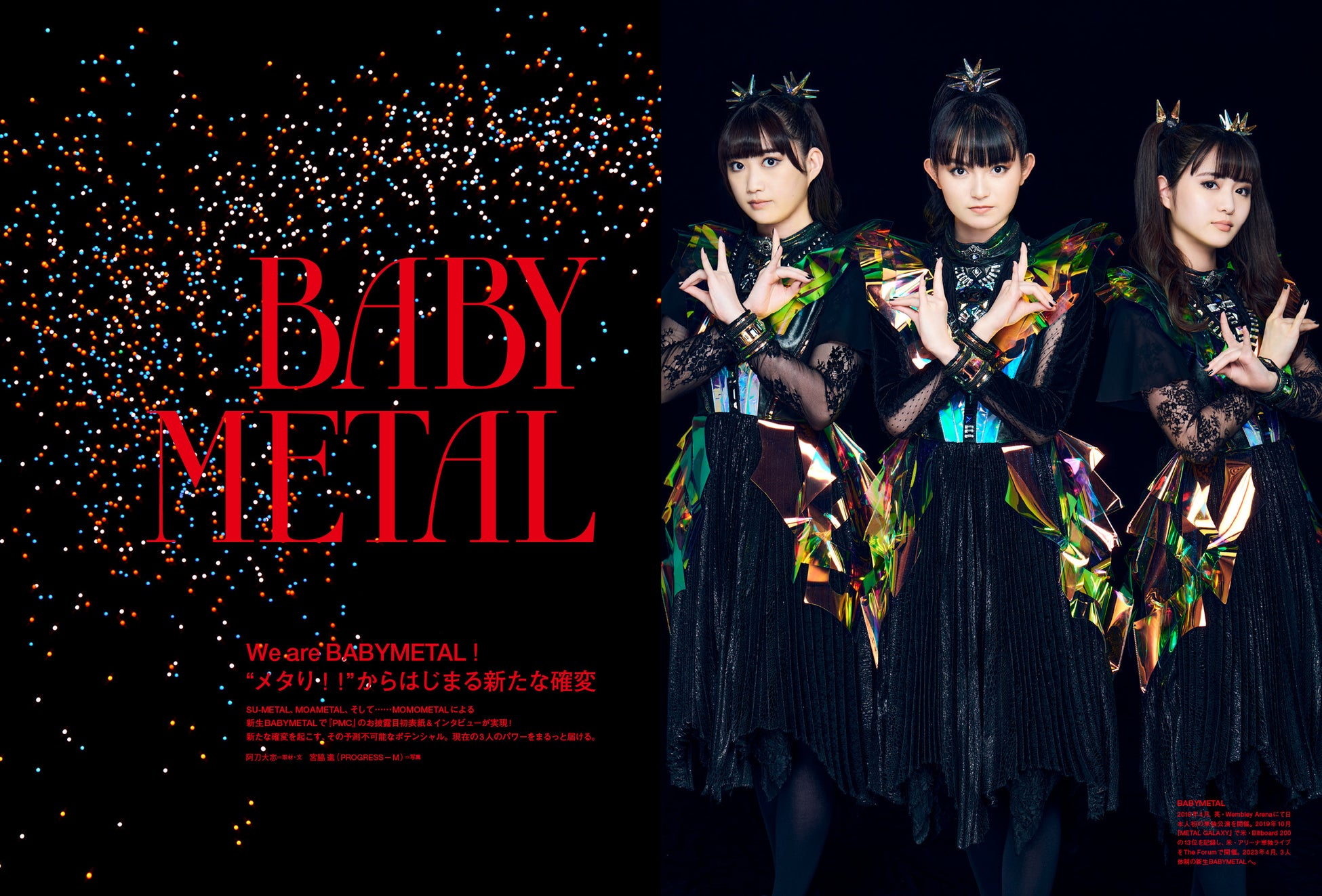 4月1・2日に開催された「BABYMETAL BEGINS – THE OTHER ONE -」にて、SU-METAL、MOAMETAL、MOMOMETALの3人による新体制を発表したのち、お披露目公演を実施。さまざまな思いが交錯したこのときの思いを語ってもらいました。現在、史上最大のワールドツアー中の3人ですが、その過酷なスケジュールの中、なぜ笑顔でいられるのか? さらに新生BABYMETALとして初となる新曲「メタり!! (feat. Tom Morello)」の制作秘話ほか、メンバー3人そろってのロングインタビューは新たなグルーブで会話が展開する必読の2万字です。