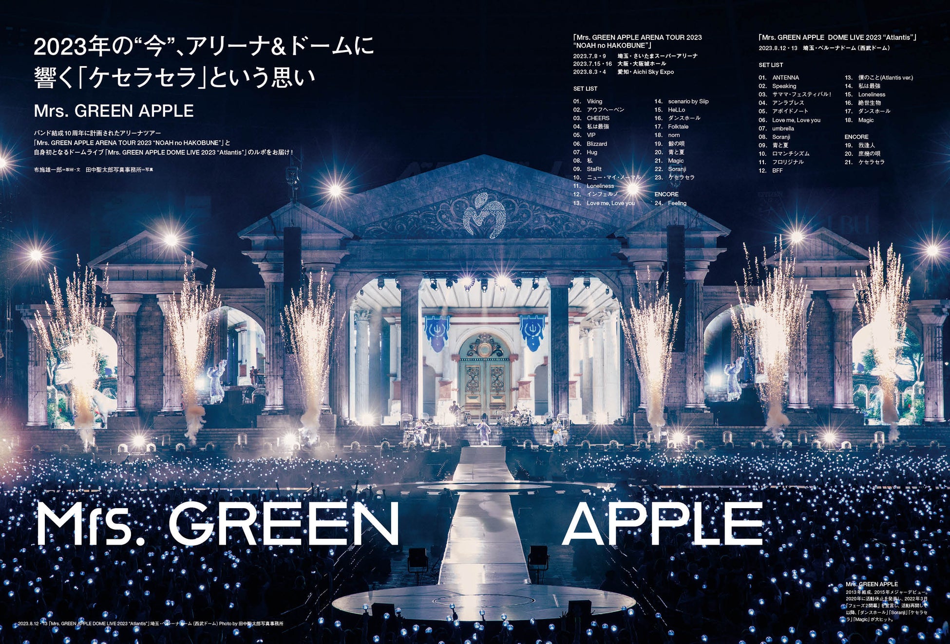 Mrs. GREEN APPLEは、バンド結成10周年に計画されたアリーナツアー「Mrs. GREEN APPLE ARENA TOUR 2023 “NOAH no HAKOBUNE”」と初となるドームライブ「Mrs. GREEN APPLE DOME LIVE 2023 “Atlantis”」のルポを通して、2023年に彼らが伝えたかった思い、さらに、彼らのエンタテインメントの真髄に迫ります。