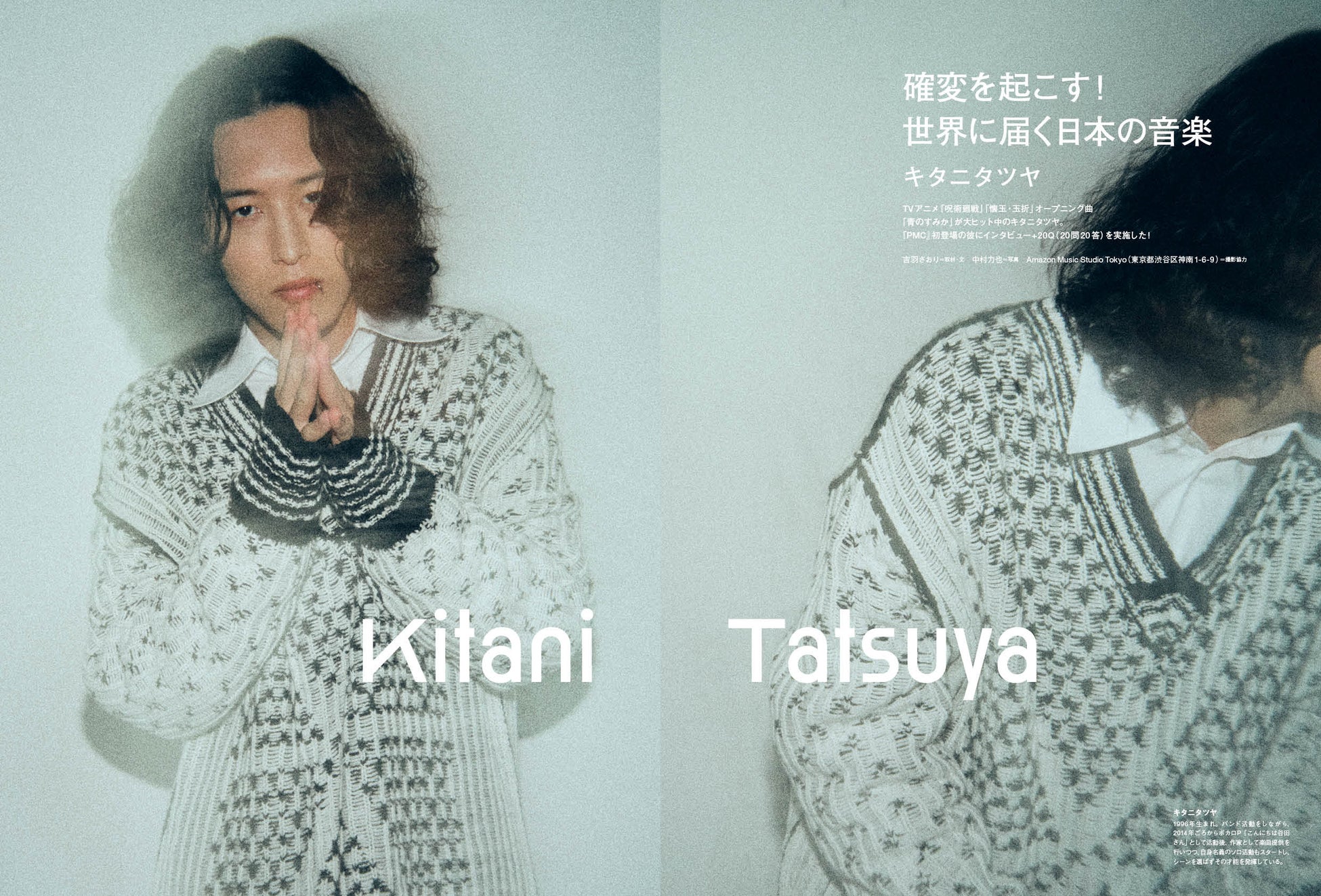 TVアニメ『呪術廻戦』「懐玉・玉折」オープニング曲「青のすみか」が大ヒットを記録し、注目を集める新星、キタニタツヤに、国内のみならず世界中で聴かれる今、J-POPへの確信を語るとともに、20Q(20問20答)でその人物像に迫ります。