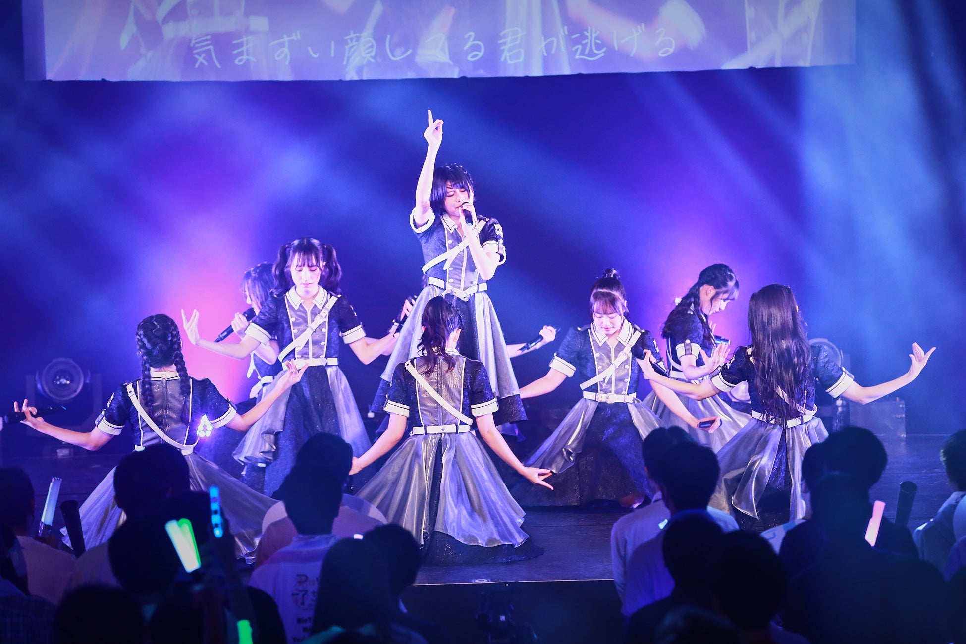 9人のメンバーが1人ずつ、別のメンバーをキャッチコピーで呼んでいく「他己紹介」つきの自己紹介を挟んで、「#超絶かわいい(カレアイVer.)」、「ぎじれんあい」を客席通路までファンに近づいてパフォーマンス。「ぎじれんあい」では波左間美晴が客席にあざとくビームを飛ばす瞬間もあり、会場はいっそう盛り上がった。