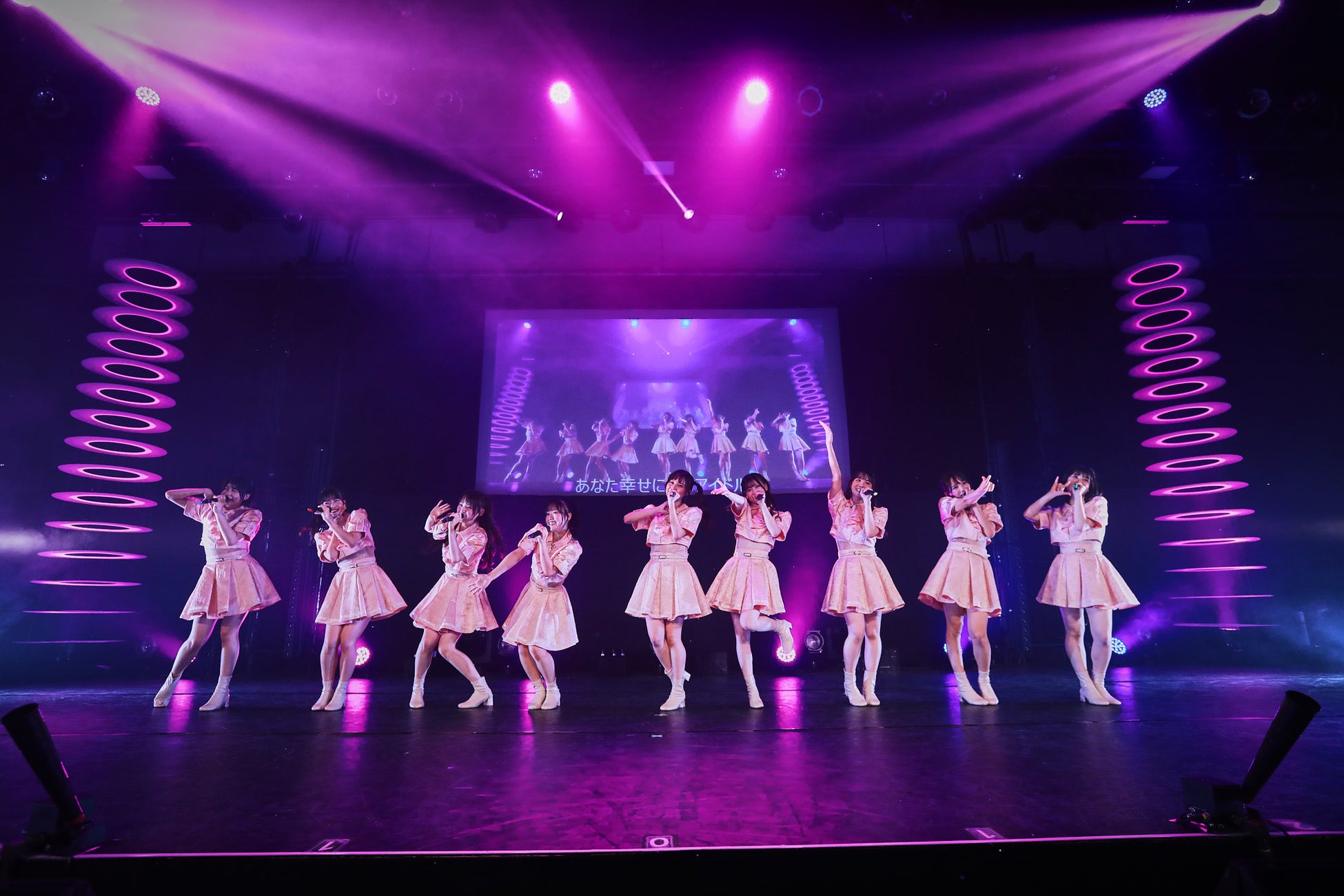 アイドルになる夢を叶えると、22年には「推し変なんて許さない!」がTikTokを中心にブレイクした彼女たちだが、それもメンバーには悔いが残ったという。SNSの反応や他のグループの台頭で、自分たちの未熟さを思い知る。そんな気持ちがスクリーンの映像で伝えられた後、「推し変なんて許さない!」に始まり、「花火より恋」「私、アイドル宣言」と初々しくキュートな楽曲を披露していく。衣装もピンク衣装になり、キラキラのアイドルらしい笑顔をふりまいた。