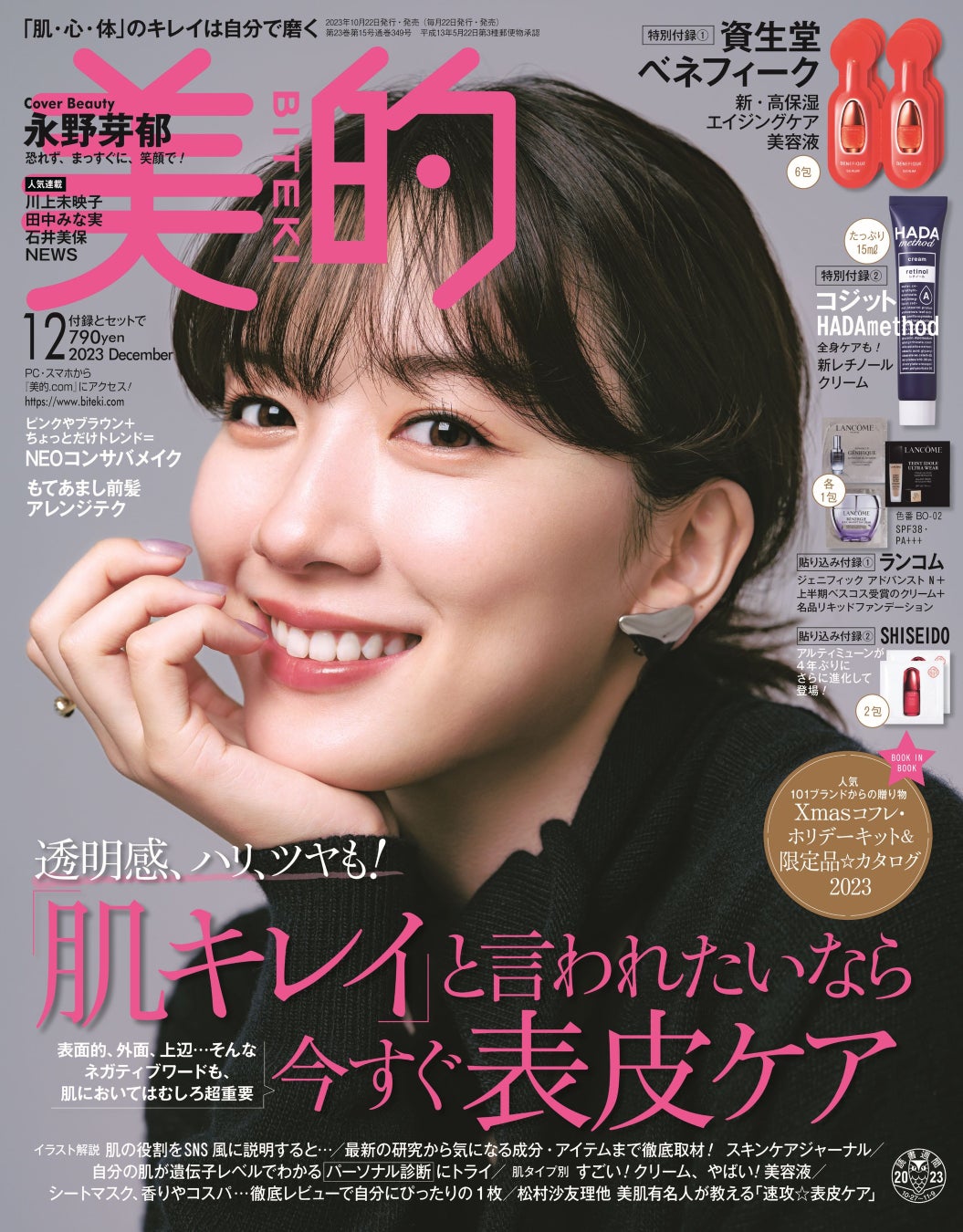美容誌『美的』12月号の表紙を飾ってくれたのは、永野芽郁さん。ツヤツヤほっぺが印象的な、透き通る笑顔を魅せてくれています。白美肌によく映える、鮮やかなグリーンのトップス×淡いパープルのネイルとカラフルな色合いが目をひく付録違い版表紙(写真右)とあわせて、2パターンでお届けします。
