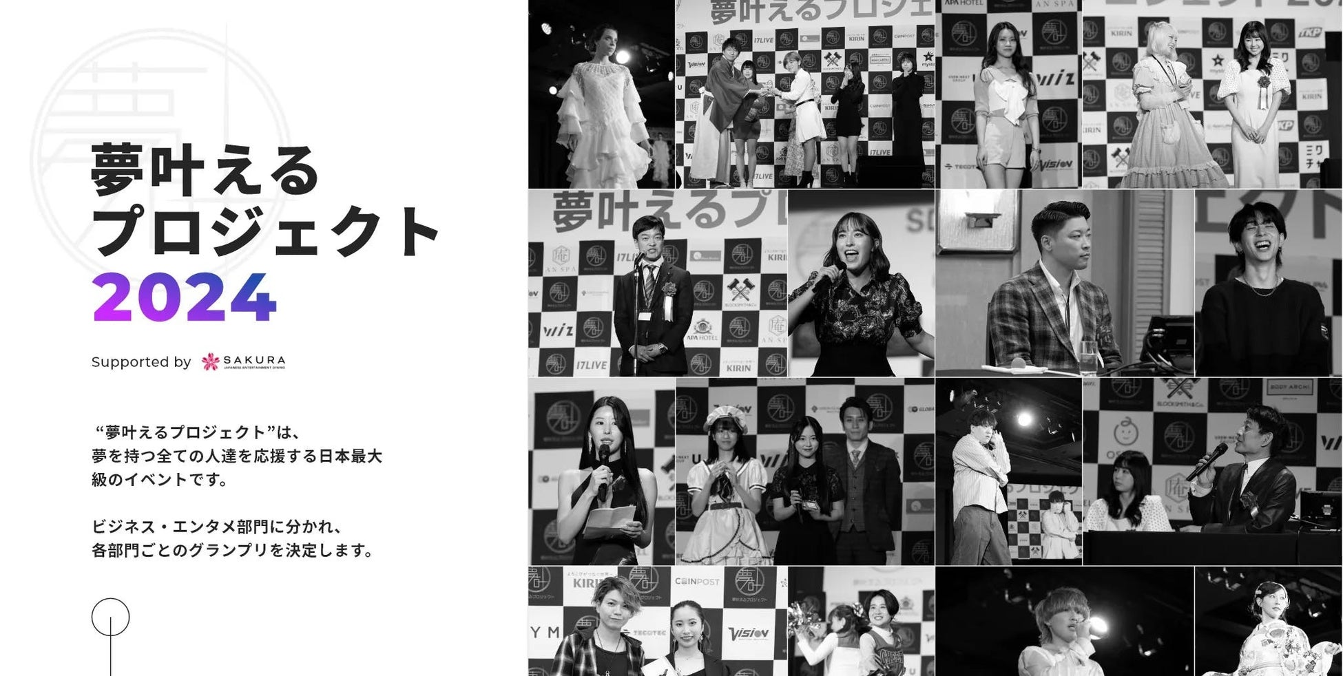 株式会社ホステックが運営を行なっている「夢叶えるプロジェクト」は、飲食・観光・WEB・ファッションなど部門別にグランプリを決め、「夢にチャレンジする」人たちをバックアップしていく、夢を持つ全ての人を応援する日本最大級エンタメビジネスコンテスト。今年3月27日に帝国ホテルにて“夢叶えるプロジェクト授賞式”が開催され、特別審査員を務めるゆうこすやはじめしゃちょー、アパホテル社長の元谷芙美子などに出席して頂きました。配信や動画・書類などの予選を経て最終審査、全10部門から1名ずつグランプリが決定しました。今年度も「夢叶えるプロジェクト2024」を開催中。今年度は株式会社クレドインターナショナルが運営するエンタメレストランSAKURAが冠スポンサーとなり、今後は日本全国で様々なオーディションやイベントを開催していく予定です。