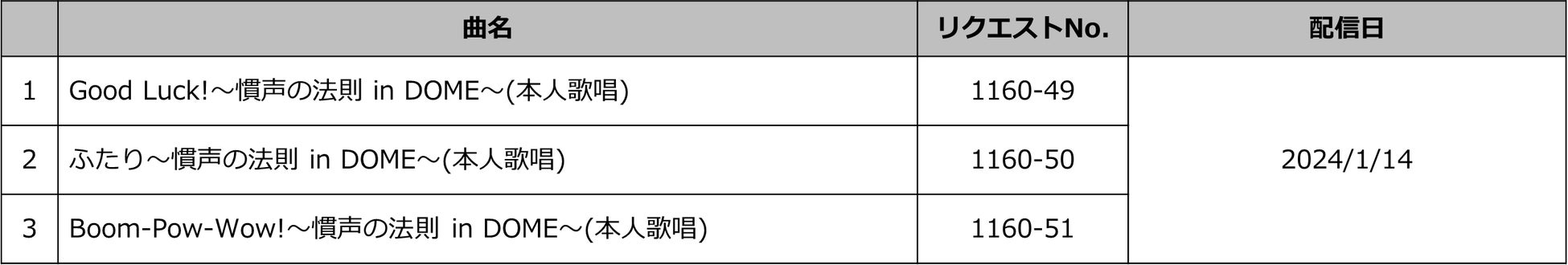 また、2023年4月23日に東京ドームで開催された『慣声の法則 in DOME』から、カラオケでも人気の3曲をLIVEカラオケとして1月14日より配信!