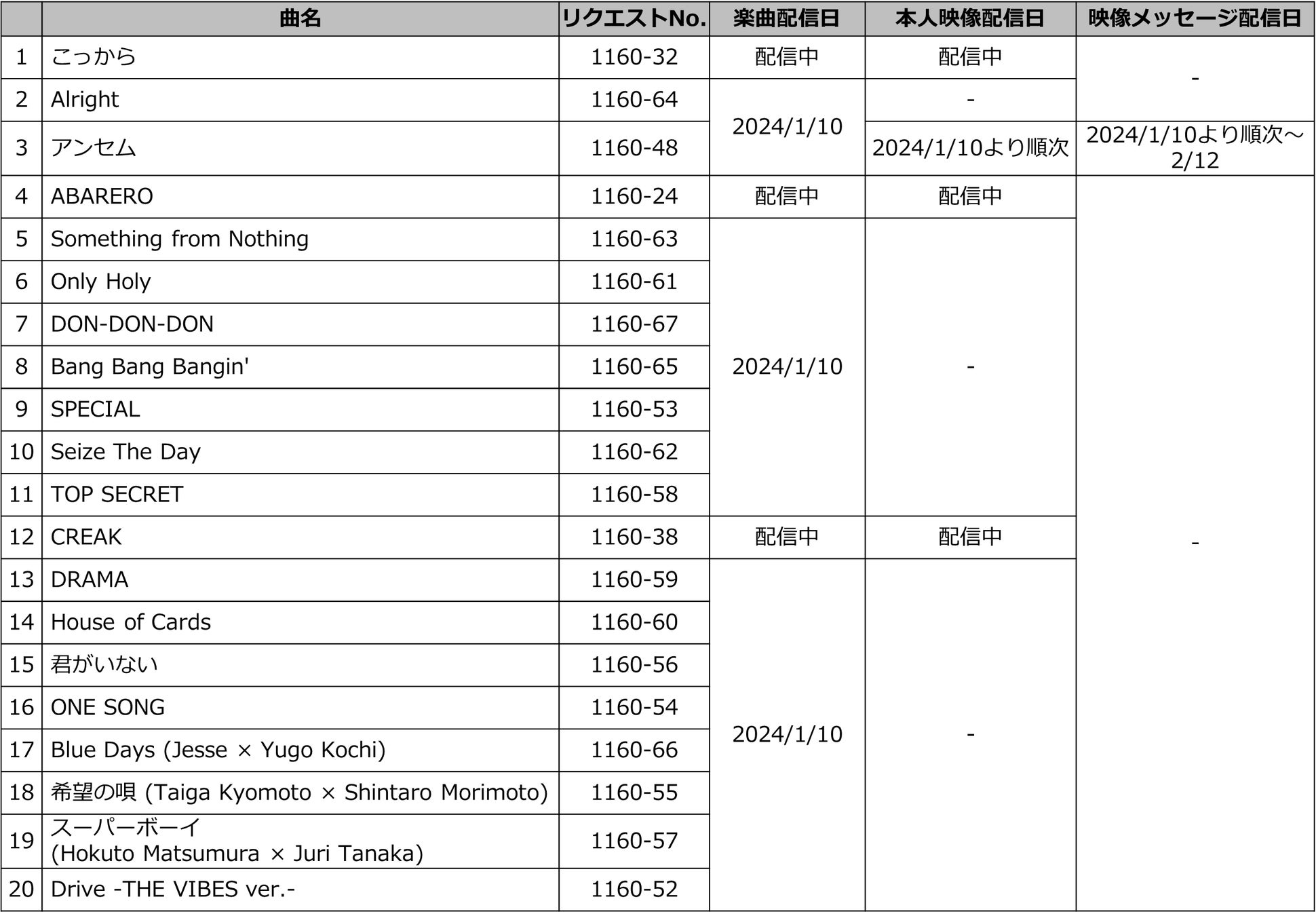 ②『THE VIBES』の中から「アンセム」の本人映像を配信。また、楽曲終了後にDAMでしか見ることができないメンバー(松村北斗、森本慎太郎)からの映像メッセージを期間限定で配信。*2【2024年1月10日(水)より順次~2月12日(月)】
