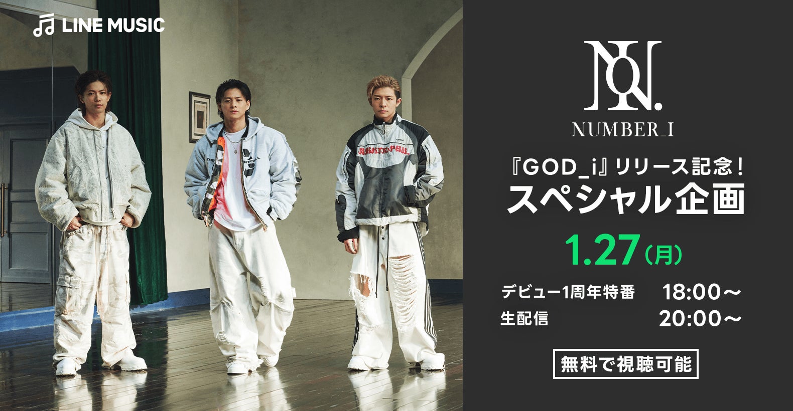 LINEヤフーは、「LINE VOOM」と「LINE MUSIC」を横断して、本シングルのリリースを記念したスペシャル企画を実施します。前半は18時より「LINE VOOM」にて、神宮寺勇太さん、平野紫耀さん、岸優太さんが登場し、MCの藤田琢己さんとともにさまざまな演出でデビュー1周年を振り返る特別番組を配信、後半は同日20時より「LINE MUSIC」にて、MCにトレンディエンジェルの斎藤司さんを迎え、1月27日(月)リリースの新曲「GOD_i」に込められたメッセージや裏話などを掘り下げ、ここでしか観られないトーク盛りだくさんの生配信をお届けします。いずれも「LINE VOOM」と「LINE MUSIC」だけのスペシャル配信です。さらに、LINE MUSICではLINE MUSIC公式X(旧Twitter)でNumber_iへの質問を大募集、寄せられた質問は1月27日(月)の生配信内で発表します。