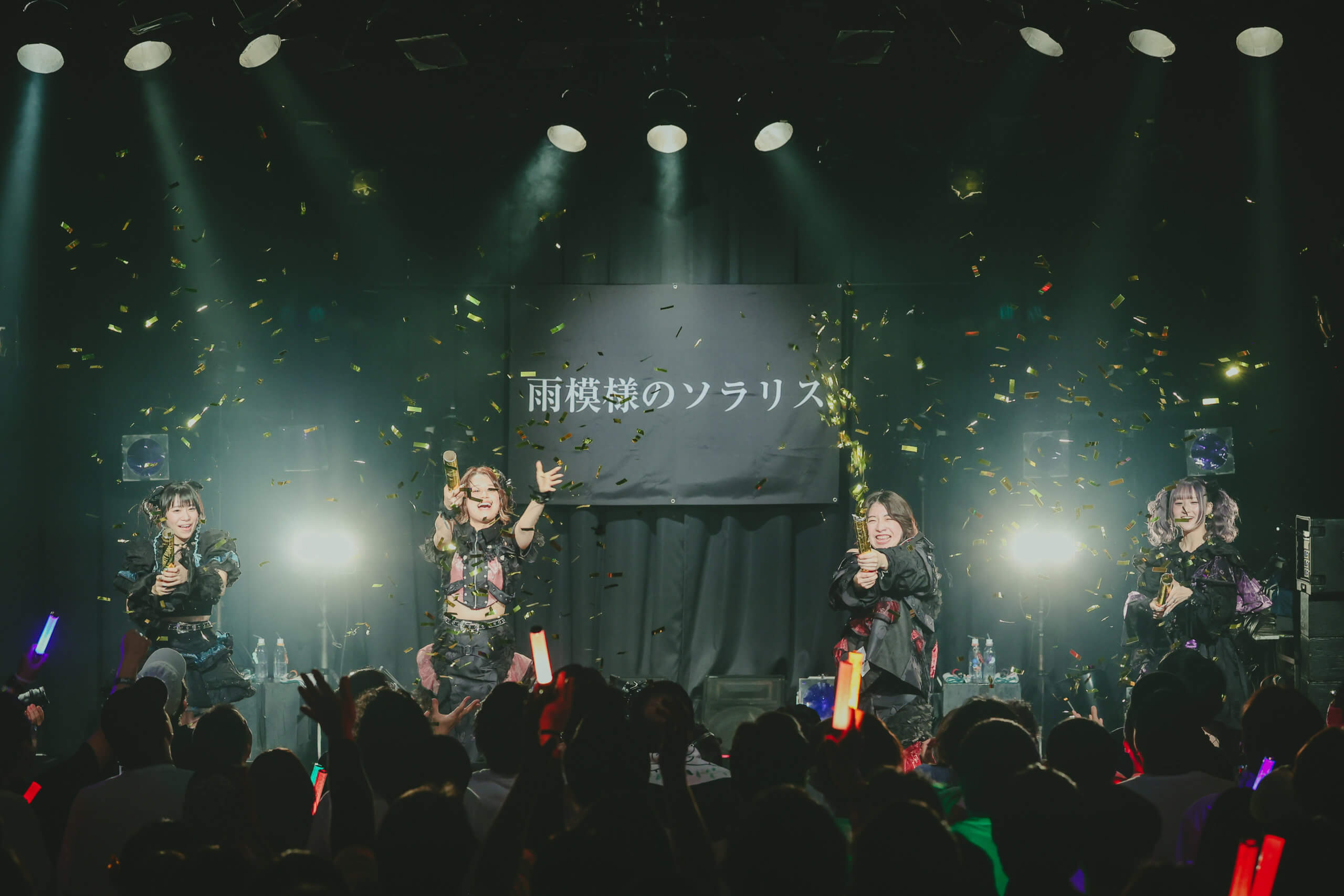 衣装の紹介が終わると、4人は金の特大クラッカーを用意。ファンと声を合わせて「雨ソラ、5周年おめでとう!」。金の紙吹雪が舞い、第2ブロックがスタート。