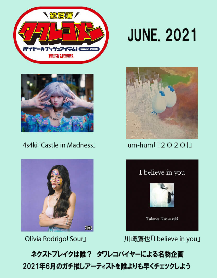 タワレコメン 6月度ラインナップが決定! 4s4ki・um-hum・Olivia Rodrigo・川崎鷹也