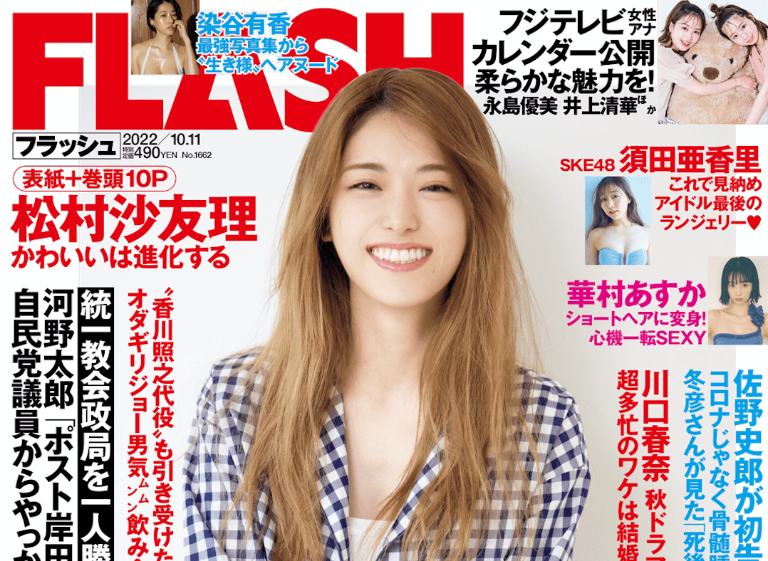 ニュース Talent 主演作を含む2本の連ドラに出演・松村沙友理が表紙と巻頭グラビアに!アイドルラストグラビア、SKE48・須田亜香里、ショートカットでイメージ一新の華村あすかも必見の『FLASH』は9月27日(火)発売9/27(火) 16:04